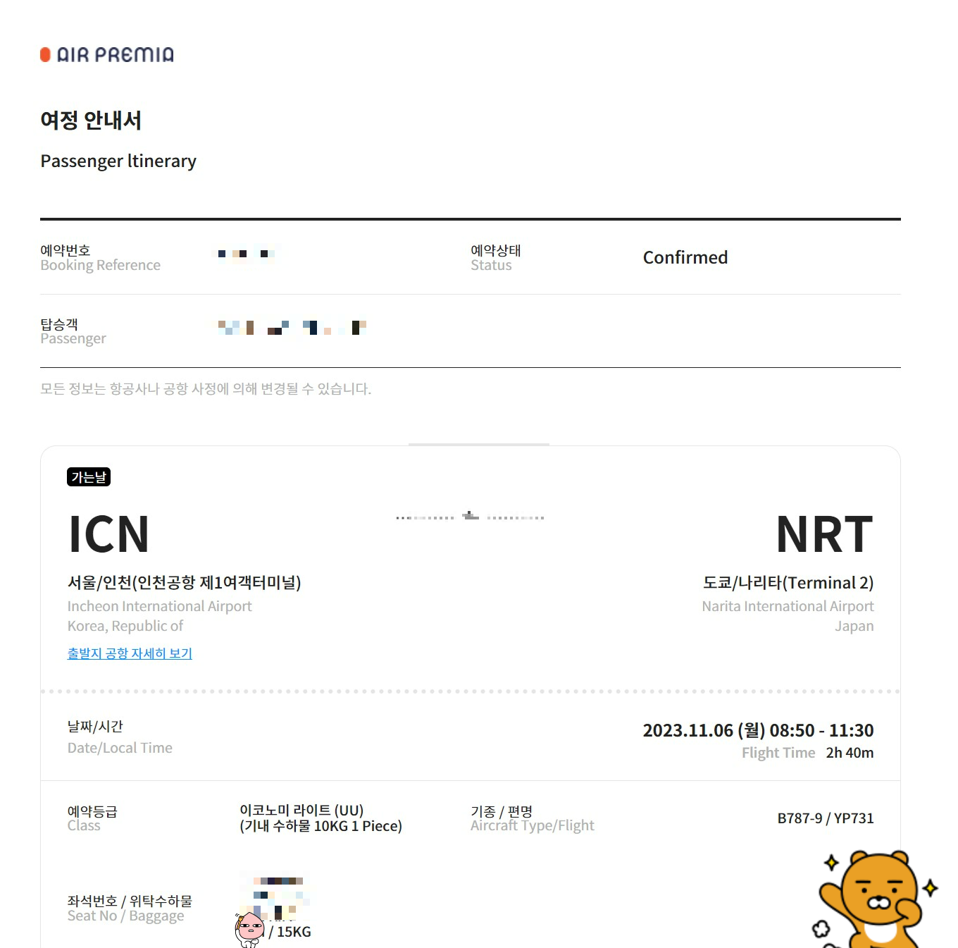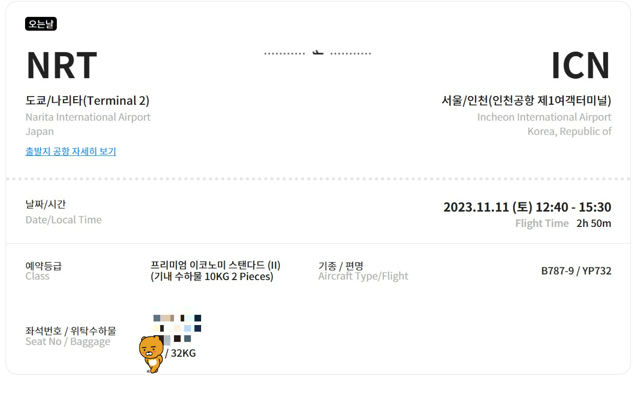 올때   나리타 → 인천      프리미엄 이코노미 스탠다드